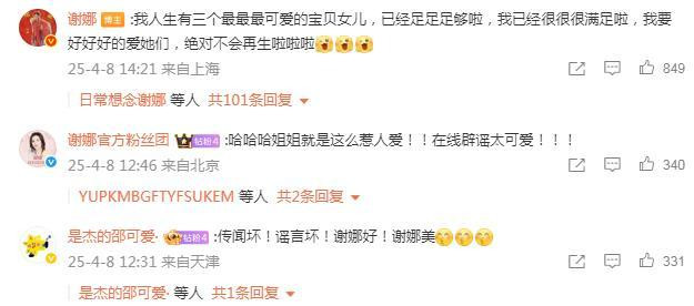 紧接着谢娜又现身评论区首次公开回应生三胎一事,谢娜表示自己已经有三个最最最可爱的宝贝女儿,已经足够,她也很满足,那作为妈妈,她会好好的爱她们,绝对不会再生啦。